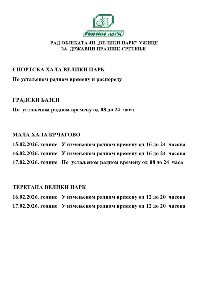 Насловна / Uncategorised /  РАД ОБЈЕКАТА ЈП „ВЕЛИКИ ПАРК” УЖИЦЕ ЗА ДРЖАВНИ ПРАЗНИК СРЕТЕЊЕ